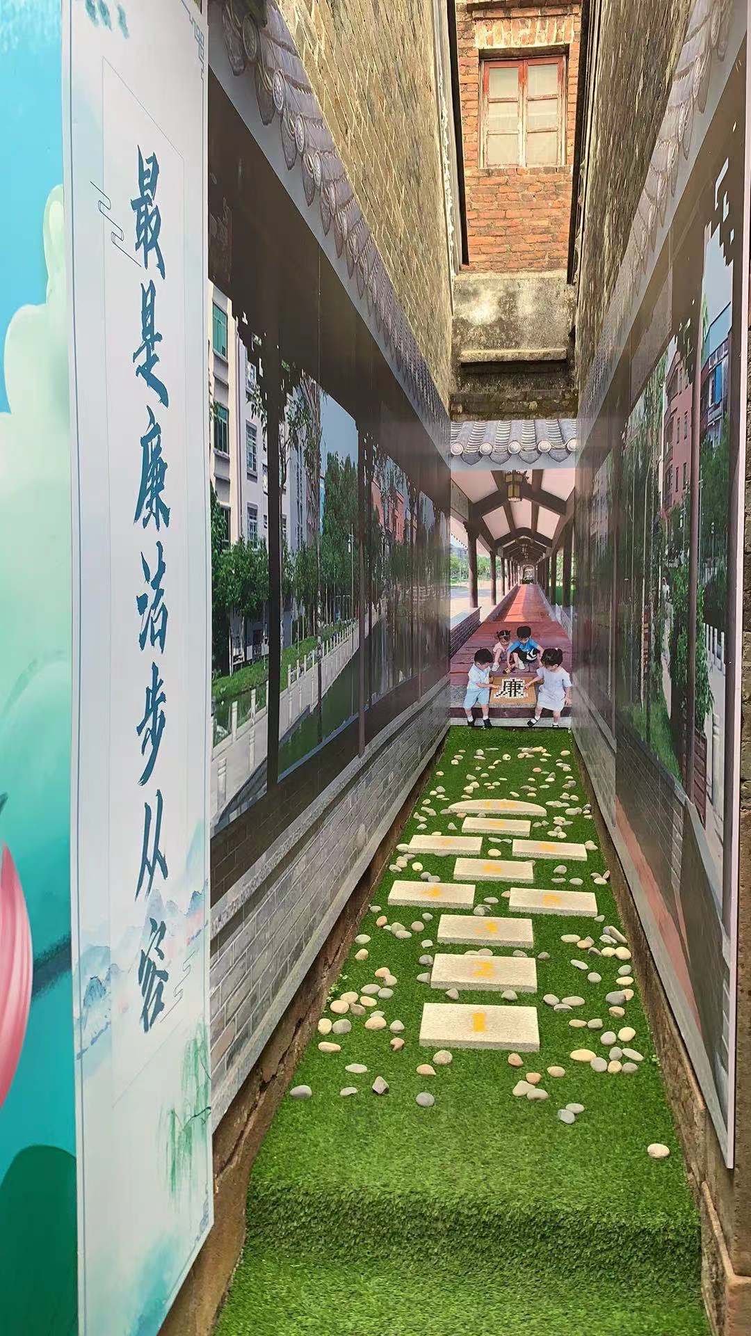 基地旁侧有个小巷,主要是打卡留影区。墙壁展示的是古村落的长廊场景,地面设置了充满童趣的跳飞机图案,提醒我们必须要走好人生的每一步。