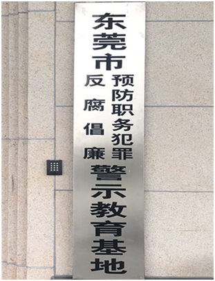 2014年1月3日在东莞监狱挂牌成立了东莞市反腐倡廉和预防职务犯罪警示教育基地,该教育基地采取组织实地参观监狱、听取服刑人员现身说法等方式,使受教育者在思想上受到震慑,重新认识自由与守法的意义,深化廉洁从政意识,达到警示教育的效果。东莞监狱是我省监狱系统首批对外开放单位之一,本基地主要利用400多平方米的多功能报告厅,升级改造成带有廉政文化元素的“警示体验厅”,专供受教育者现场听取职务犯罪人员作现身说法、警示悔过。